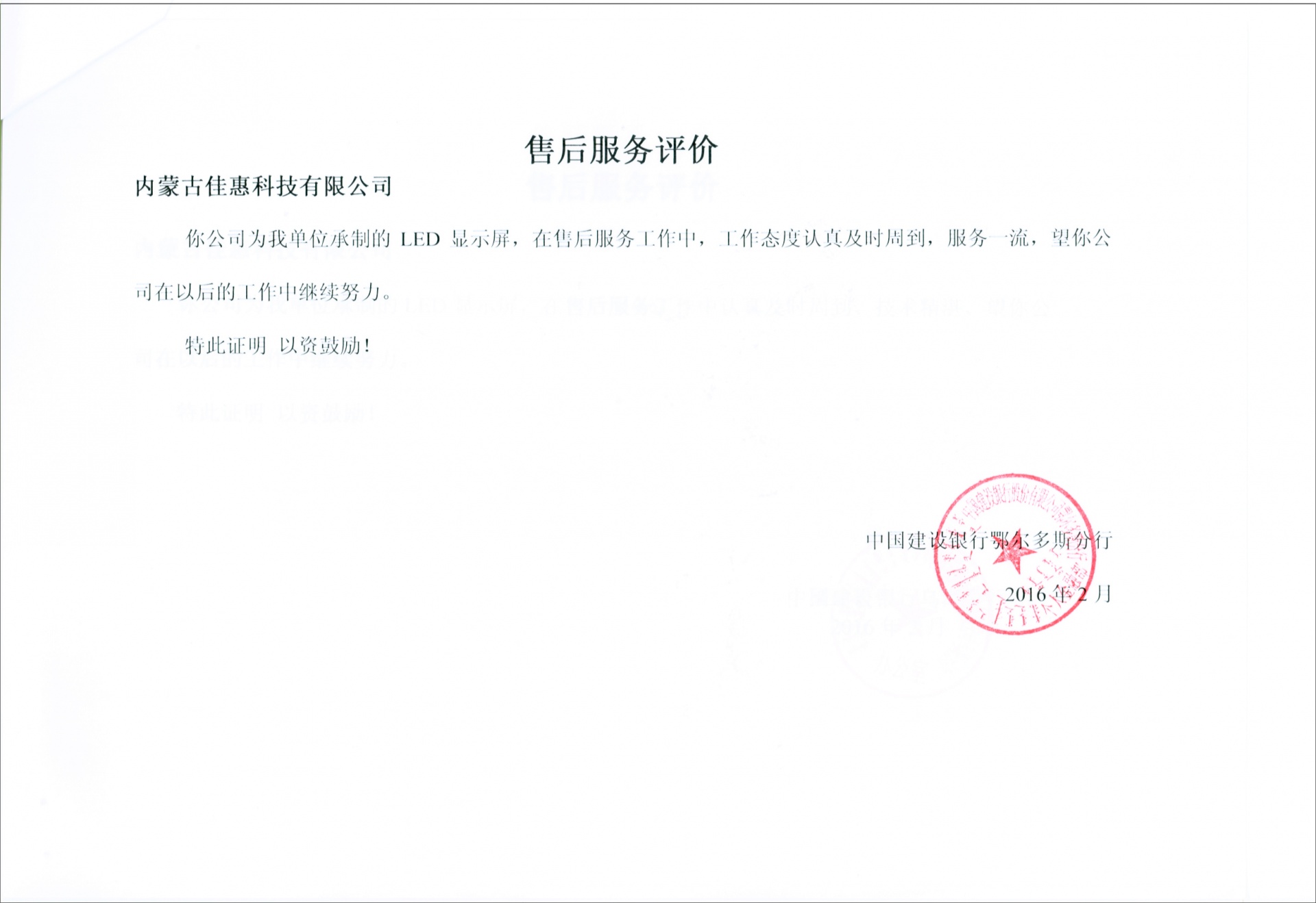 下一條中國建設銀行內蒙古分行準格爾優質服務證書