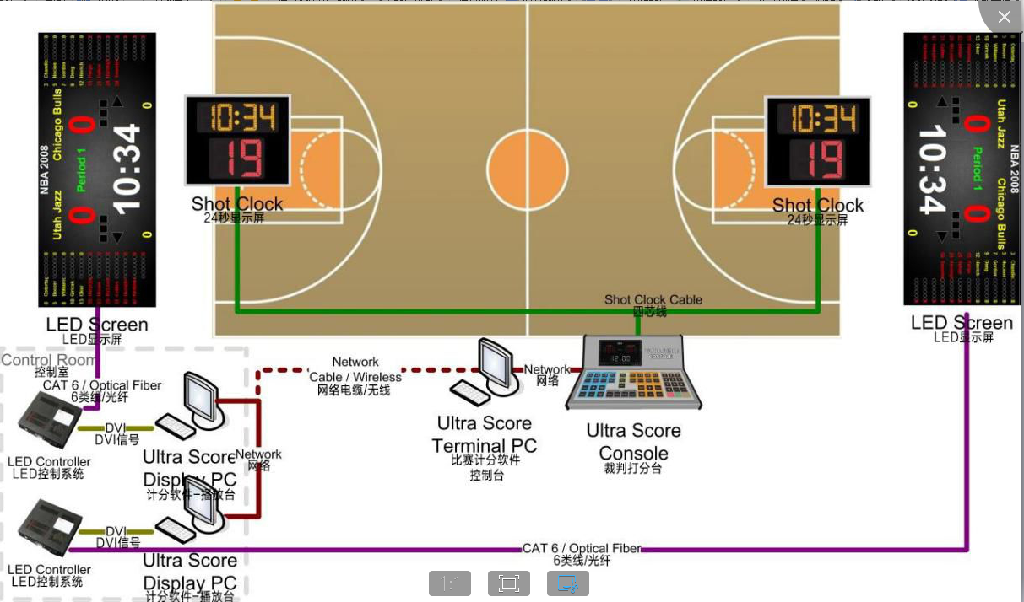 體育館兩邊安裝兩塊LED顯示屏,兩塊屏后的控制室內(nèi)分別設(shè)立控制電腦,負(fù)責(zé)大屏的控制和顯示,大屏通過(guò)LED數(shù)據(jù)和控制電腦相連。場(chǎng)館內(nèi)設(shè)立局域網(wǎng),兩臺(tái)LED顯示屏控制電腦都連入網(wǎng)絡(luò),同時(shí)比賽期間放于場(chǎng)邊的裁判操作電腦連入局域網(wǎng),該電腦與籃球打分控制器相連接,比賽時(shí)裁判只需要在場(chǎng)邊進(jìn)行打分。兩塊大屏可同時(shí)顯示相同信息,也可以各自分別顯示不同的內(nèi)容。兩邊的籃球架上都安裝籃球24秒專用顯示屏,并用數(shù)據(jù)線連接到場(chǎng)邊的24秒控制臺(tái)上,比賽中可由專人負(fù)責(zé)進(jìn)行比賽和24秒計(jì)時(shí)操作。24秒控制臺(tái)與場(chǎng)邊的裁判控制電腦可以使用數(shù)據(jù)線連接,則也可以使用軟件來(lái)控制24秒計(jì)時(shí)的顯示同時(shí)在場(chǎng)邊配置了一套籃球?qū)S玫姆敢?guī)顯示器(單面顯示),用于顯示賽隊(duì)犯規(guī)次數(shù)。 一套籃球?qū)S们驒?quán)控制器(單面顯示),指示當(dāng)前控球權(quán)的一方。在單獨(dú)的一臺(tái)電腦上安裝籃球比賽用軟件,用于統(tǒng)計(jì)賽程中球員的賽場(chǎng)表現(xiàn)情況。比分直播系統(tǒng)通過(guò)與體育場(chǎng)館比賽計(jì)分系統(tǒng)、籃球技術(shù)統(tǒng)計(jì)軟件進(jìn)行通訊,在采集多路現(xiàn)場(chǎng)視頻信號(hào)的同時(shí),對(duì)信號(hào)進(jìn)行本地化的快速編輯處理,實(shí)現(xiàn)現(xiàn)場(chǎng)實(shí)時(shí)比分疊加、球員信息顯等視頻播放要求。賽場(chǎng)的多媒體綜合信息發(fā)布系統(tǒng),與賽場(chǎng)計(jì)時(shí)記分系統(tǒng)聯(lián)動(dòng),用于在賽場(chǎng)周邊的屏幕上統(tǒng)一管理和發(fā)布球場(chǎng)相關(guān)的球賽得分信息、球員及裁判信息、廣告以及相關(guān)資訊、指引等。